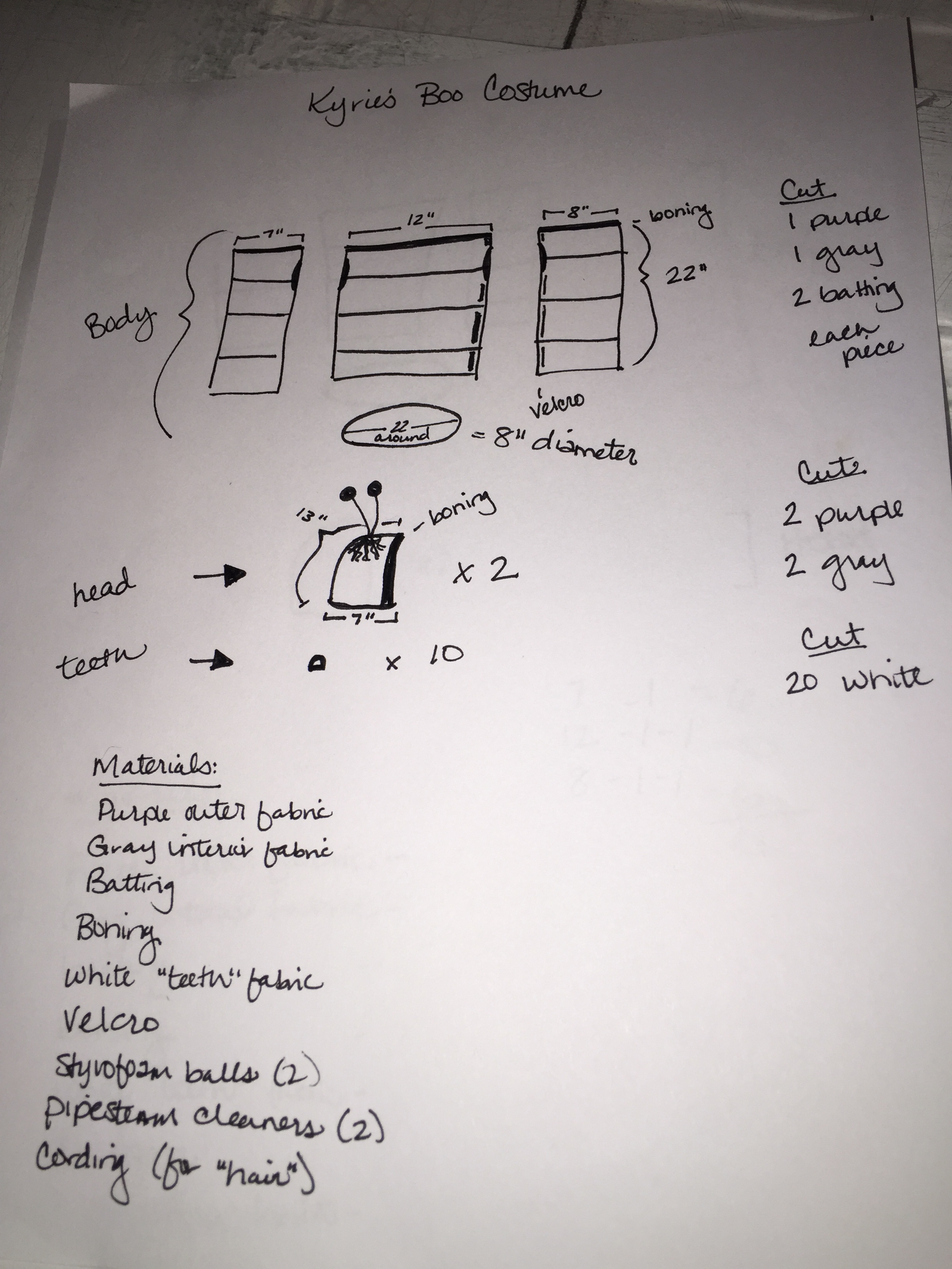 One final note, I realized after I had cut out my fabric, that I didn’t need to have two pieces for the back of the costume (I’ll explain later) so save yourself some trouble and just cut out two of the big piece.