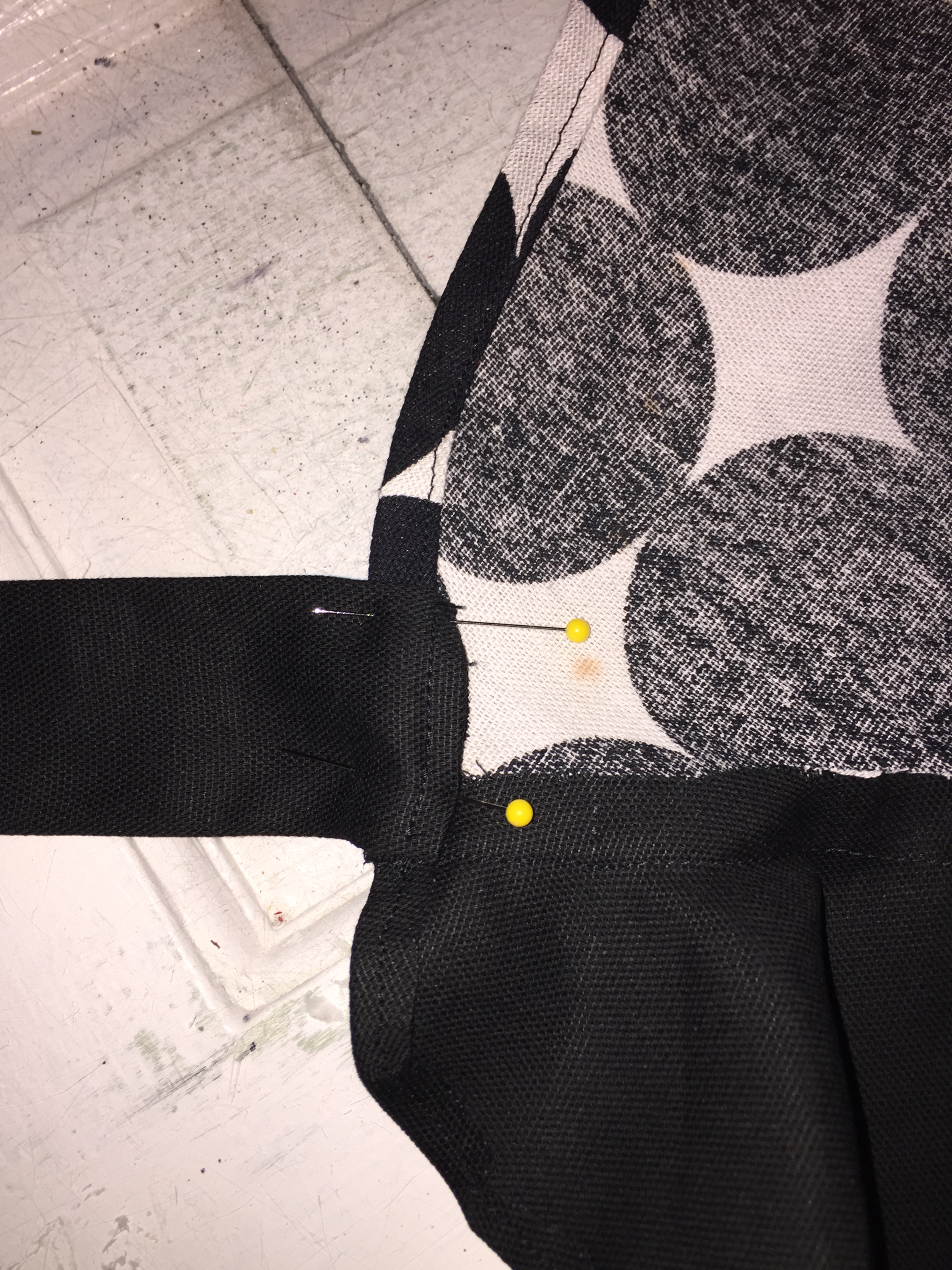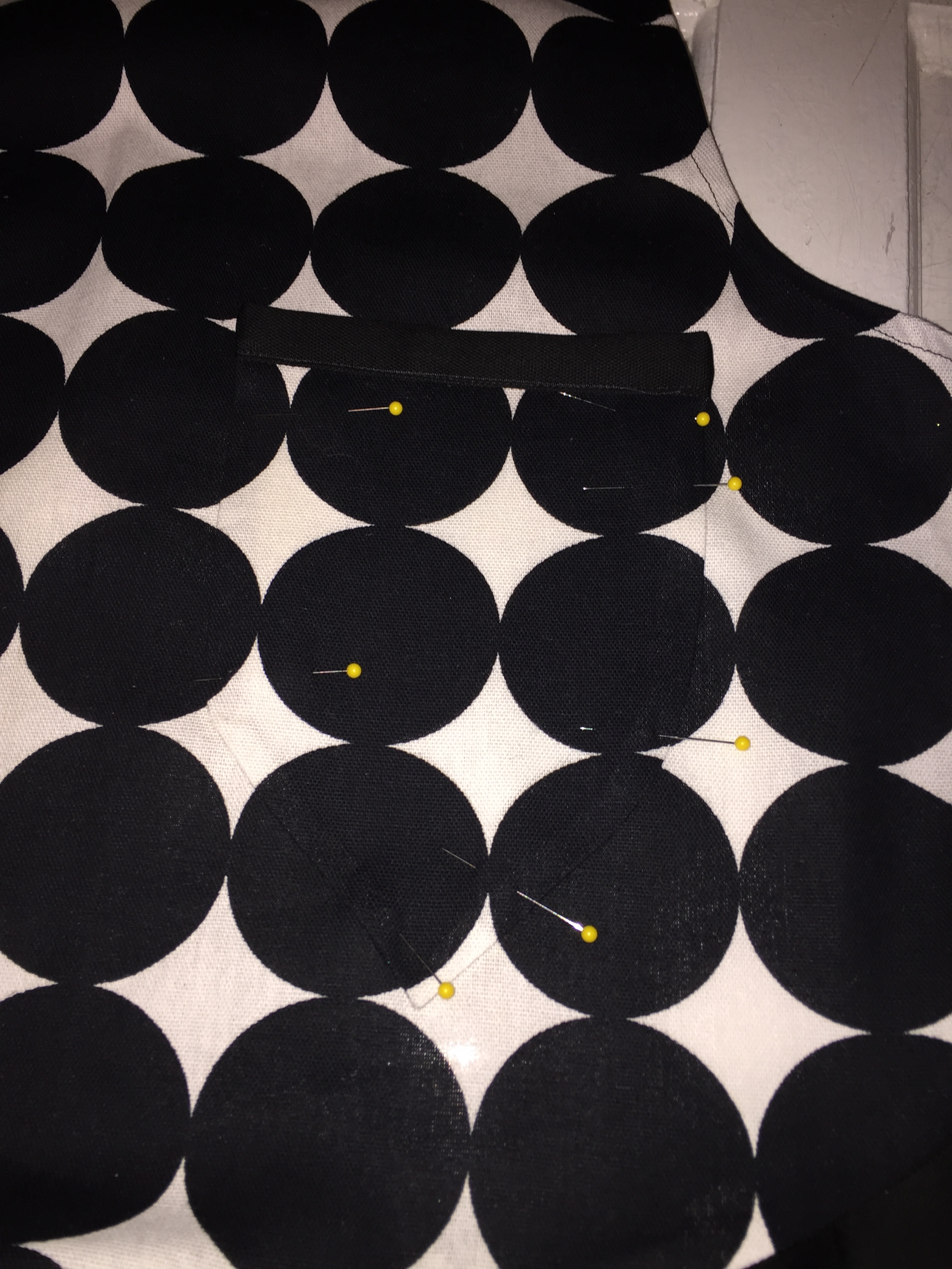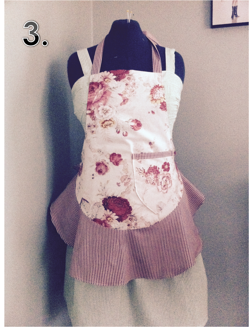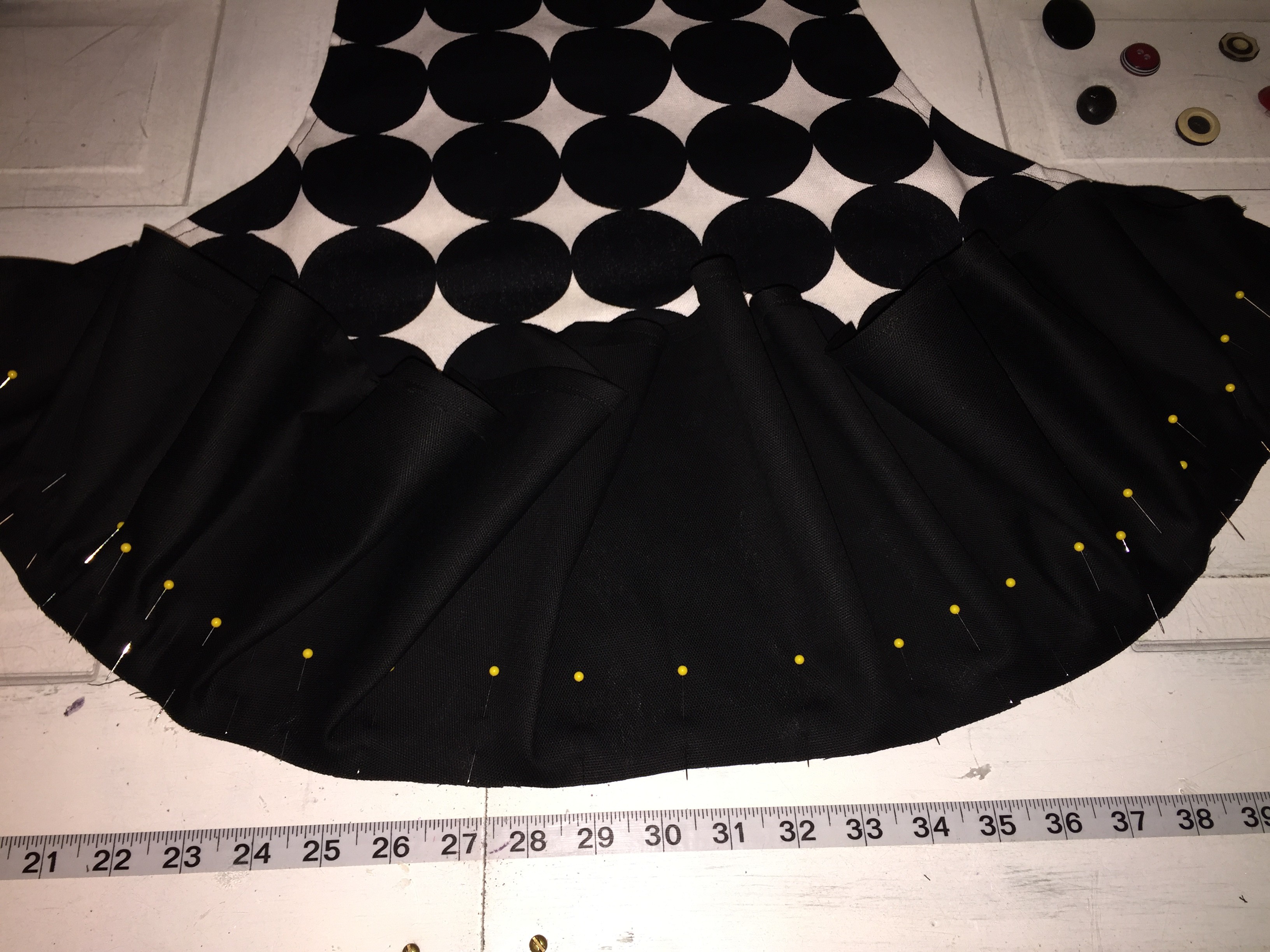 • Pin the flounce to the bottom of the body of the apron. This is also a little tricky because of the two odd shapes, but just use lots of pins. Sew. Press.