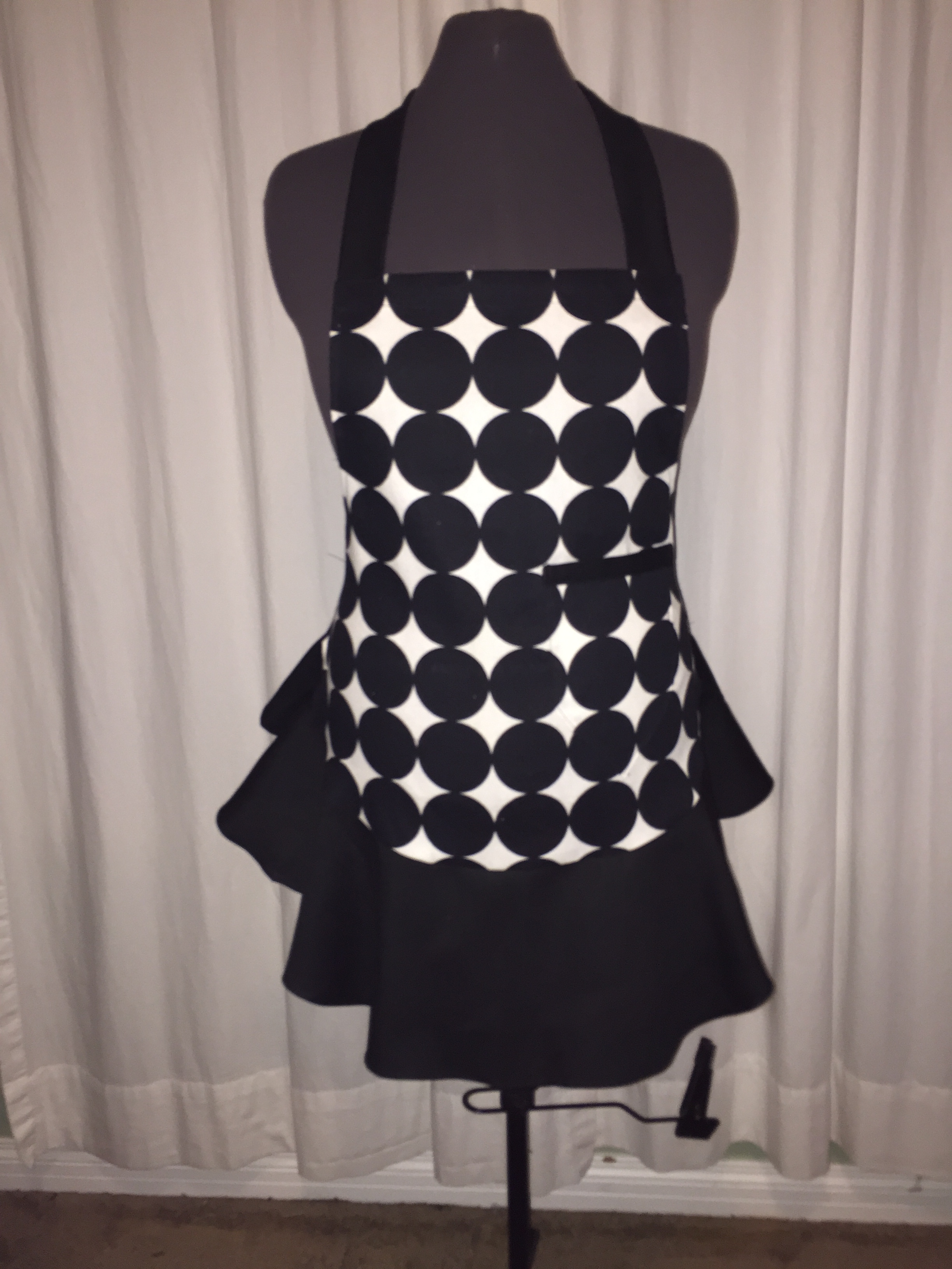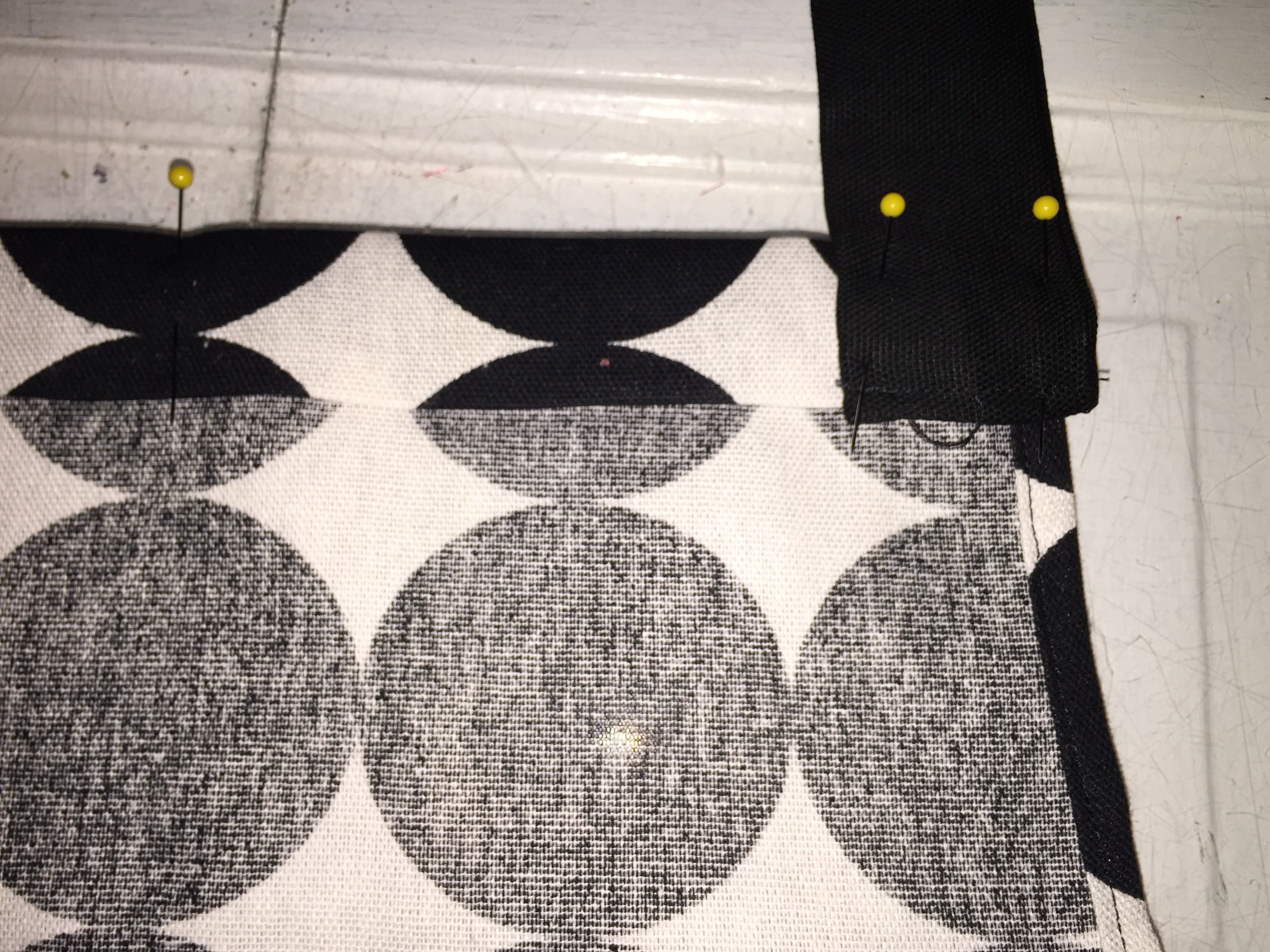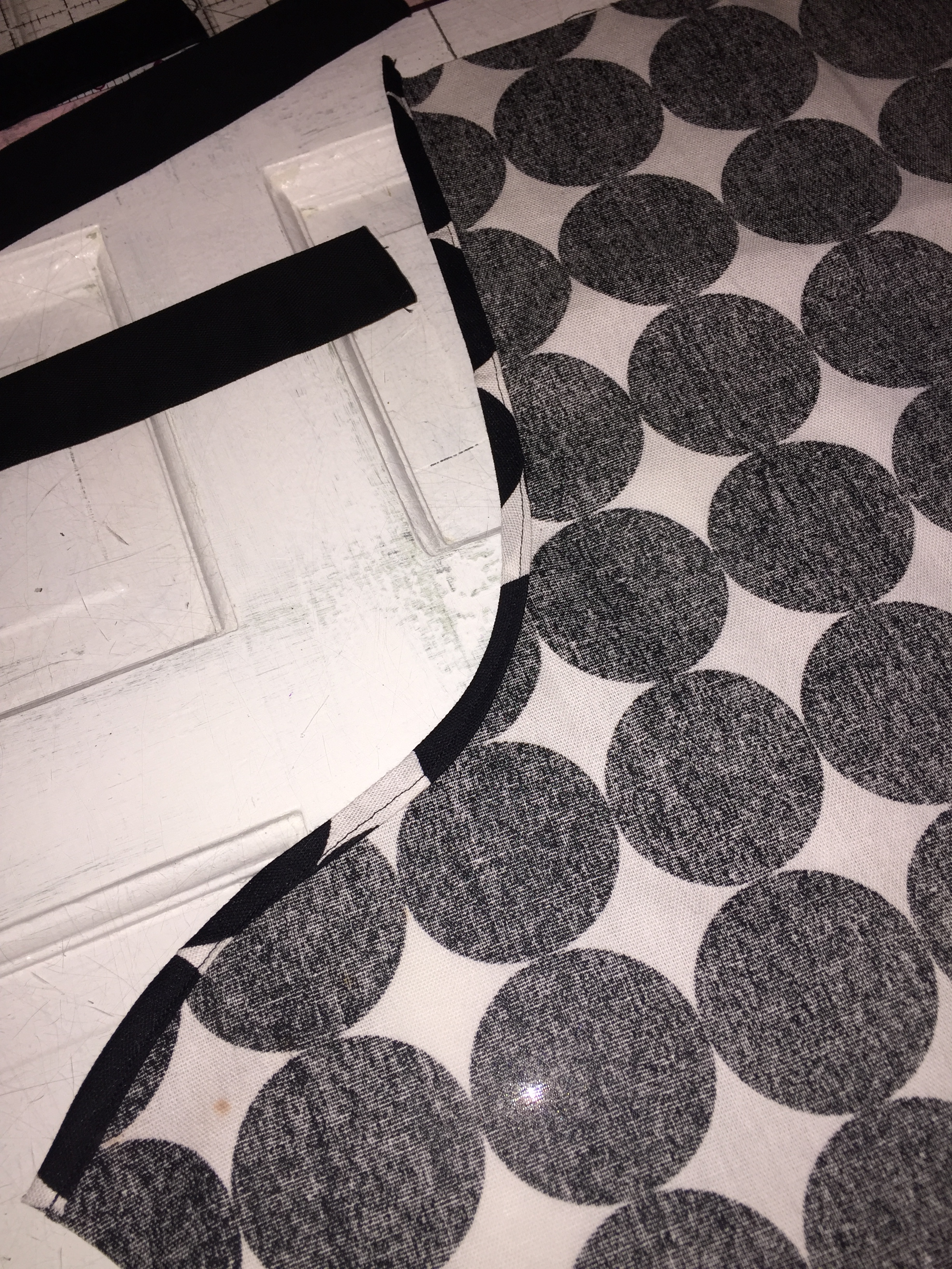 • Pin the flounce to the bottom of the body of the apron. This is also a little tricky because of the two odd shapes, but just use lots of pins. Sew. Press.