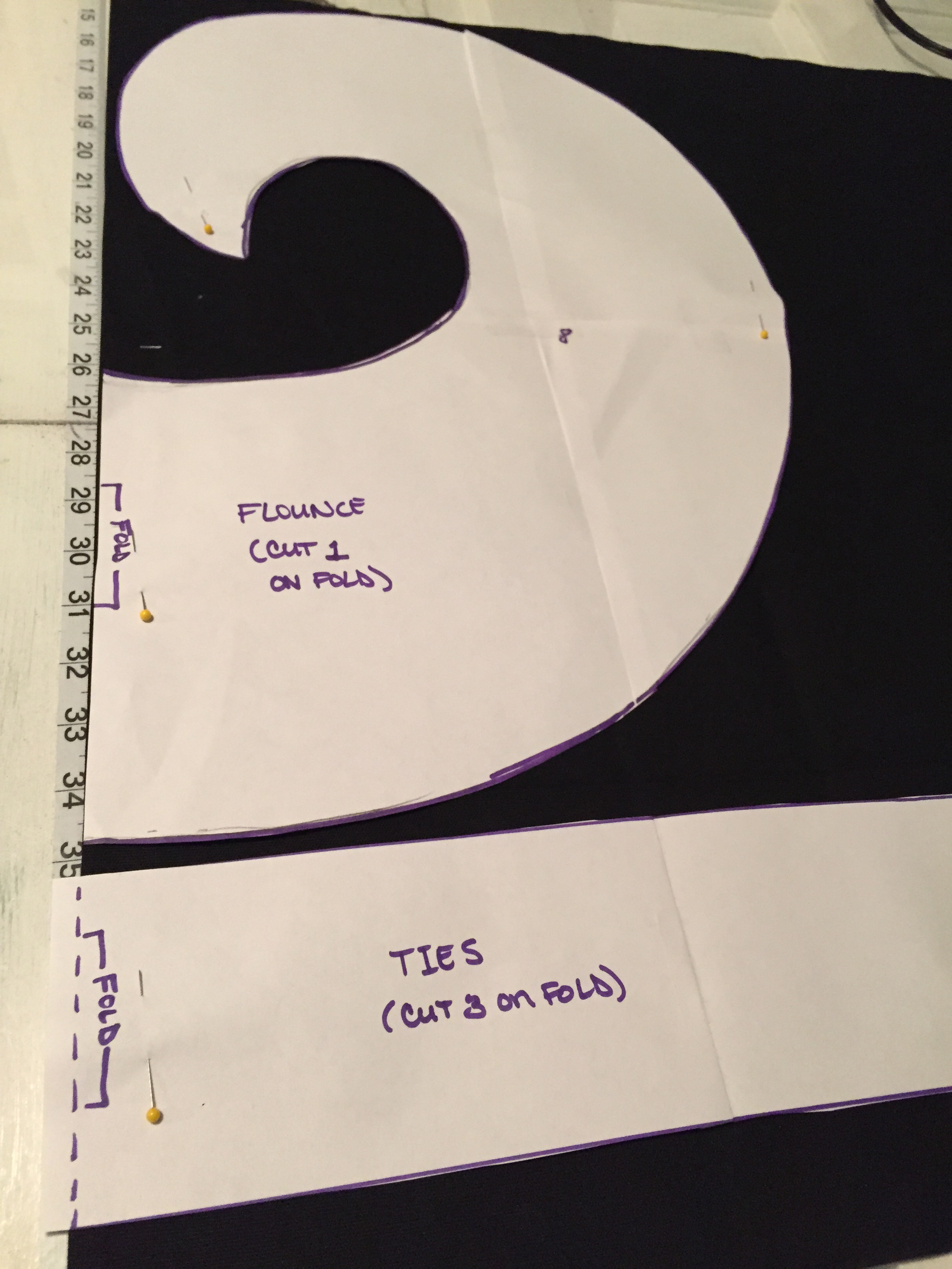 • Next, we will work on the flounce. Hem the bottom. It can be a little tricky to hem the curved edge, but I just carefully press it with an iron and it seems to work out fine.