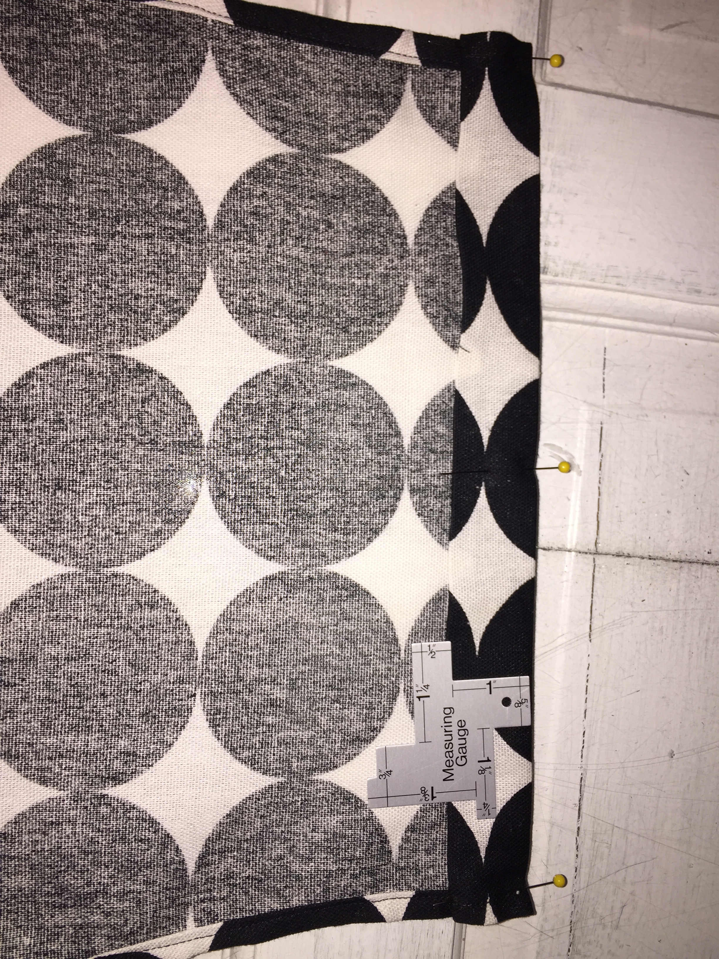• Next, let’s work on the main body of the apron. Let’s start by finishing the sides. Fold and press ¼”, and then again. This will give a nice finished edge that won’t fray. Sew both sides.