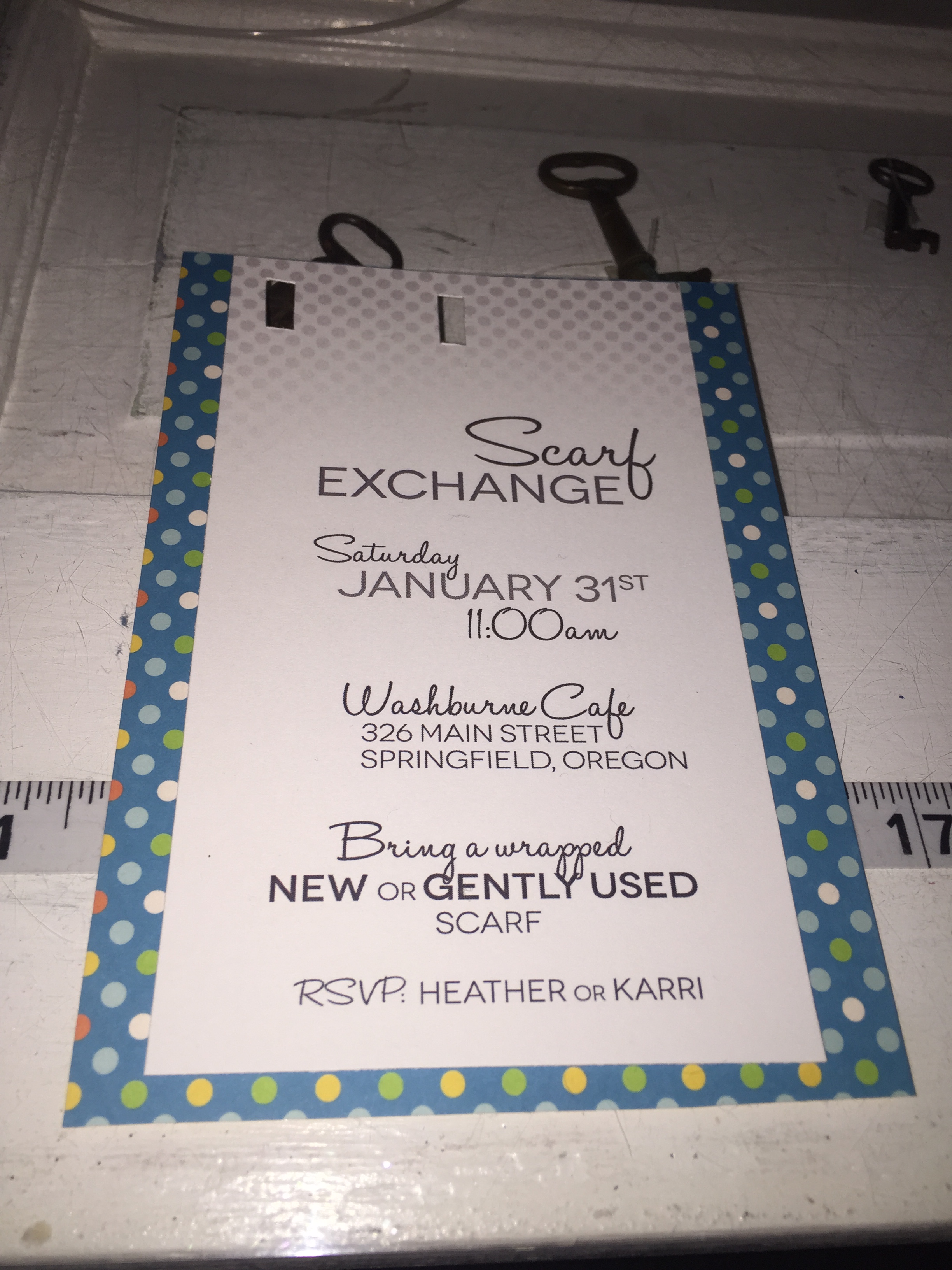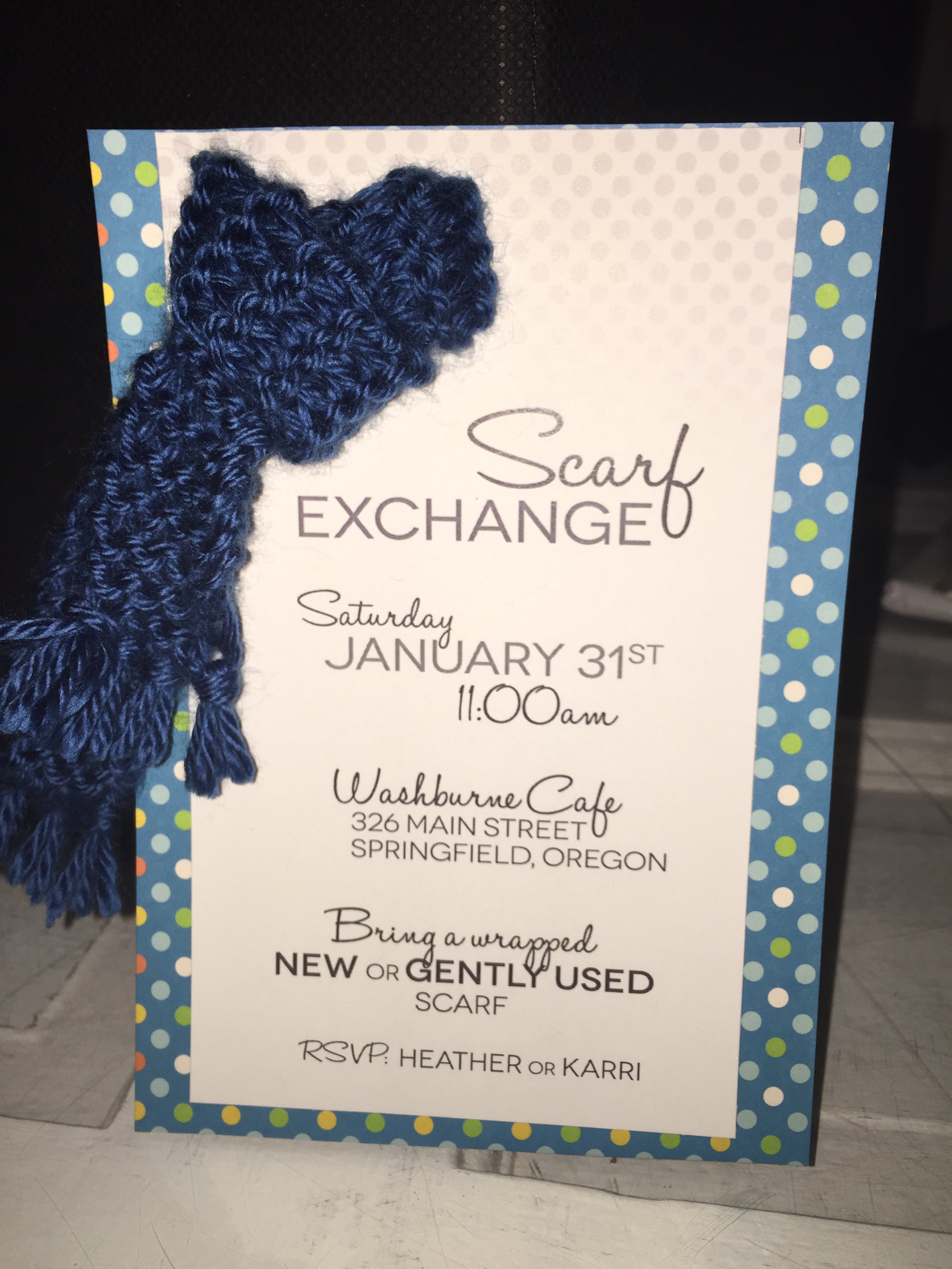 So a co-worker friend of mine and I decided to host a scarf exchange of our own to help beat the winter blues. We set the date, picked a local coffee spot, and decided to create invites to remember! Yes, that means I knitted mini-scarfs for each invite. Naturally.