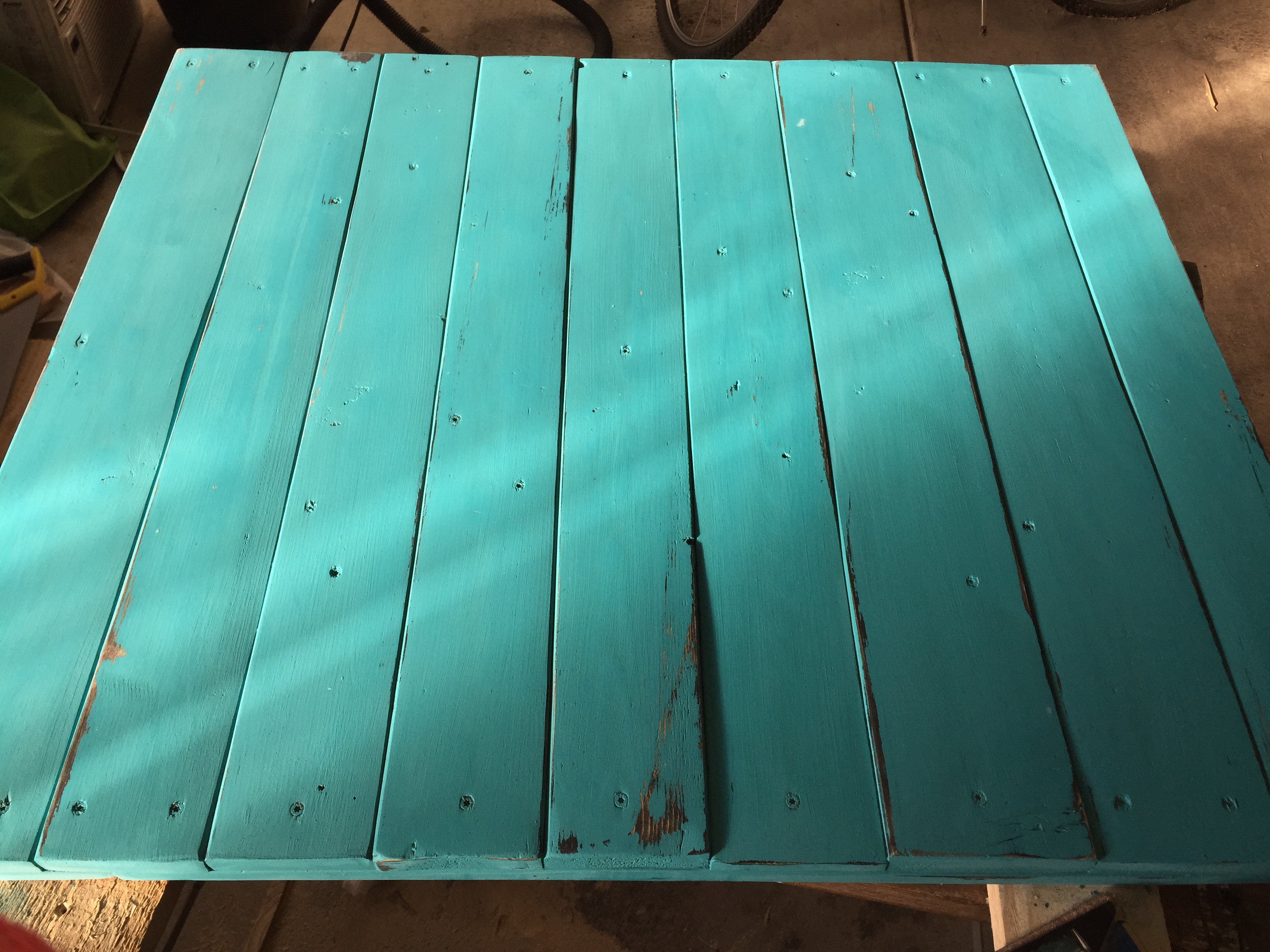 2. After letting it dry I painted my first coat of Jewel Shabby Paint, let dry and added a second coat. The chalk paint really goes far. I used about 5 ounces of paint total. Flipped the door over and did the same on the back (2 coats). Pretty!