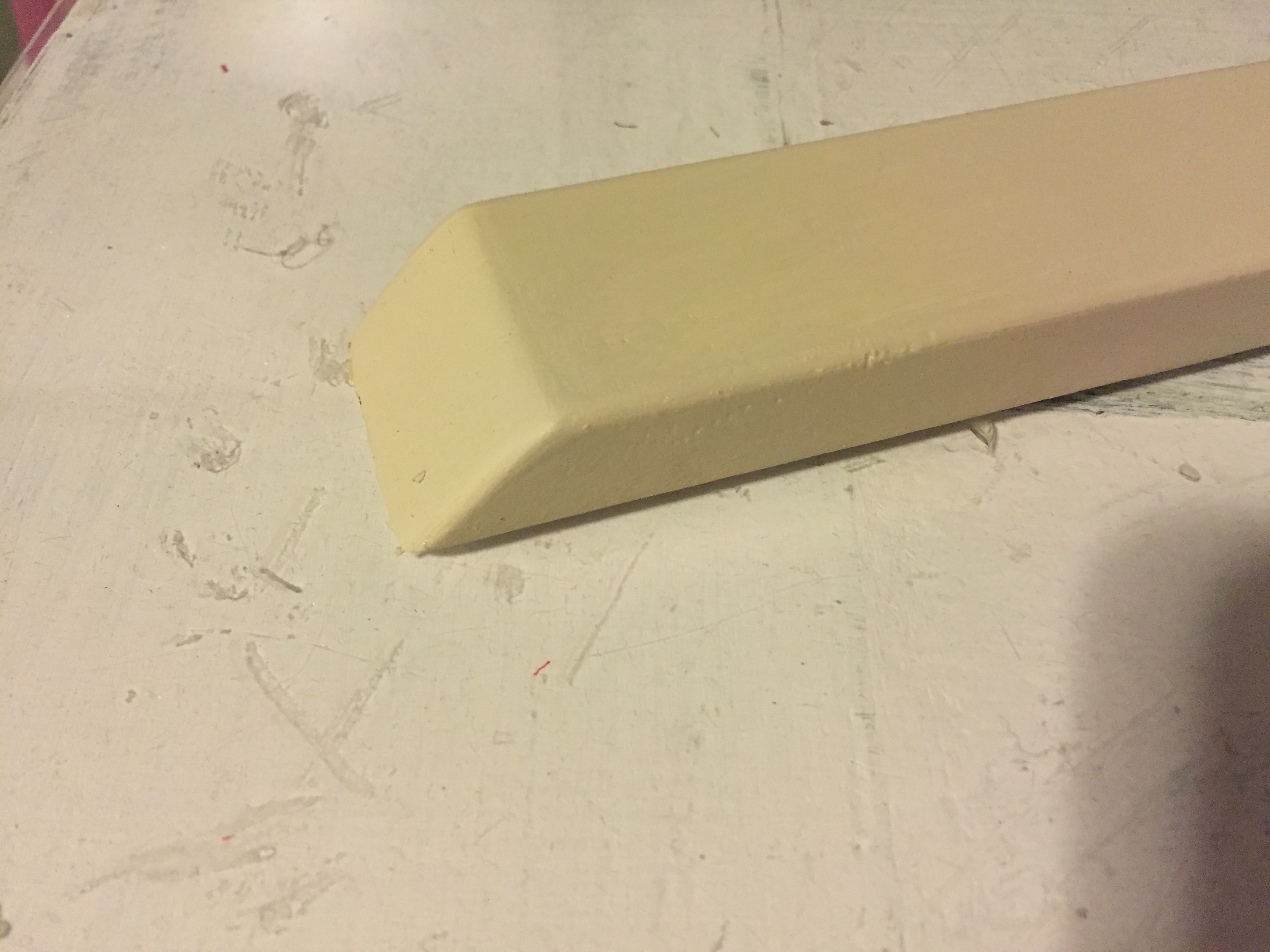1. Almost there! We started by cutting our two trim pieces, which will be mounted to the wall on either side and the door will connect to. On the top, cut a 45 degree angle (this just makes it look a little more finished). Then we painted them to match our wall color.