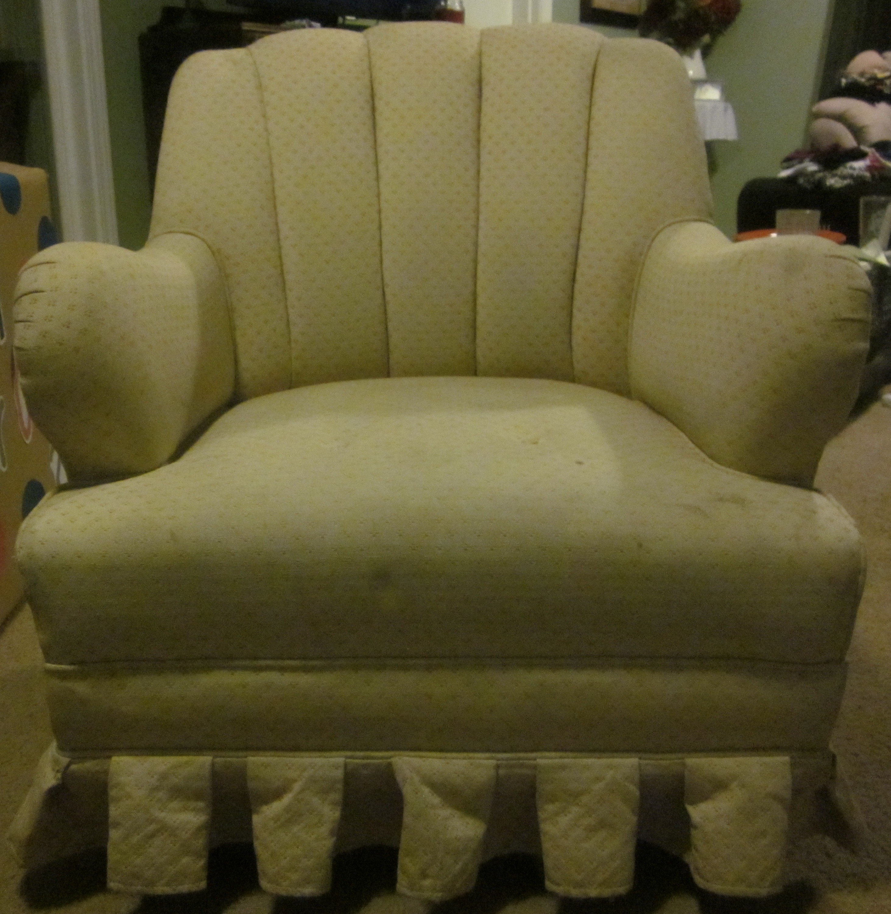 - I traced the seats out into the tissue paper and then added about 2.5″ all the way around to create a pattern. If you look closely (not only will you see my stylish slippers) you will also see my grandfather’s last name and my grandmother’s maiden name written on the back from when my grandparents were first married and had the chairs recovered. Family history right there!